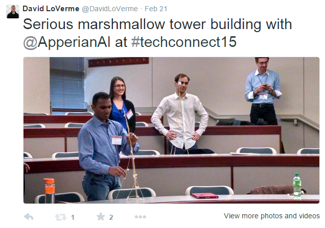 Allen is an SVP at Mobile Device Management company Apperian and his session was perhaps the most fun all day, not only because he is charismatic and approachable and I learned a ton about small aircraft flight, but also because we did the marshmallow challenge.  For those unfamiliar, it involves working in groups to form the tallest possible tower using spaghetti, tape, string, and a marshmallow on top.  MBAs typically perform terribly at this, while kindergartners do much better because the task lends itself well to trial and error and iteration and not advanced planning giving the time limits and lack of expertise in most participants (architects as the exception do quite well when planning).  Happily, we outperformed most MBAs and even kindergartners but learned that most of our assumptions were ill founded.  Allen used the activity as a jumping off point to talk about effective teams and Agile product development.