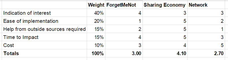 After testing a few different concepts and determining market viability, we were left with three that we felt were worth pursuing. At this point, we weighed the various choices against the criteria of indication of interest, ease of implementation, requirements for outside help, time to impact, and cost. This helped us to determine which of the concepts made the most sense to pursue. The one that won out was a crowd-sourced and curated resource about sharing economy opportunities. The win was driven primarily by the fact that it would need little development effort as it could be done with WordPress and the majority of the effort was in content generation. However, since our primary purpose is learning and we like a challenge, we decided to go after our second choice concept instead. The ForgetMeNot concept is an app that uses RFID chips to track your items so you don’t leave without them. It will be the most complicated and require the most outside help to pull off but hey, we are nothing if not ambitious! As it received the highest score on market interest, we also felt we were justified in our efforts.