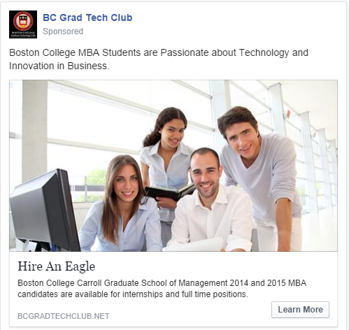 Our ad is targeting Boston College alums who work in the technology, business and IT industries. We’re looking to reach potential employers who may still feel connected to BC, and the more Eagles we have available for hire the better! If you’re still looking for internships or full time positions please email us and we’ll add you to the roster!